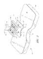 FIG. 3 is an exploded view of the base, pad and backing of the device ofFIGS. 1 and 2 illustrating a pair of flexible strands extending through aligned holes in the base and pad;