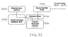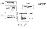 FIG. 24 shows a generic operating mode. Shown are applications such as Explorer andIIS2410,namespace provider2420, TCP/IP TDI clients such as NetBIOS and/orNFS2430,TDI hook driver2440, TCP/IP transport driver2450, secureapplication manager proxy2460, and a remote connection towards theintermediate server2470.