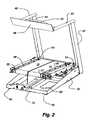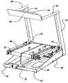 Referring again toFIG. 11 as well asFIG. 21 and others, adjacent the outertreadle frame members54, eachdeck support member56 includes aboss96. Each boss defines a threaded aperture generally perpendicular to theoverlying deck20. The threaded apertures receive correspondingbolts98 that secure the deck to the deck support members. The bolt heads protrude upwardly from the top of the deck. As best shown inFIGS. 1,2, and6, the outer edge of thebelts18 are arranged slightly inward of the bolt heads so as not to interfere with or rub on the bolt heads. Alternatively, the bolt heads may be countersunk in the top surface of the deck, in which case the belt may overly the bolts.