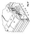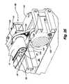 FIG. 56 is a partial isometric view of the front section of the right treadle highlighting a deck and shield support assembly.