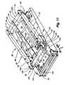 FIG. 12 is a section view taken along line12-12 ofFIG. 7. As shown inFIGS. 11,12, and others, each treadle assembly includes ashield58 or “curtain.” In one implementation, the shield, which may be fabricated with steel, aluminum, polymer, or other suitable material, defines a fairly thin generally triangular or trapezoidal plate. The shield is connected to the inner ends of thedeck support members56 distal the connection with theouter frame members54. The shield may be welded or bolted to the deck support members, or connected with an intermediate member (not shown) that is connected with deck support members. Generally, the shields extend somewhat upwardly and downwardly from the inside ends of the deck support members. The top edge of the shield is generally aligned with the top of therespective deck20. The forward edge of the shield extends downward and generally perpendicular to the front of the treadle assembly (12,14). The shield does not provide longitudinal support for the treadle assemblies or longitudinal support for the deck support members, but rather blocks a user's foot or lower leg from slipping off of one tread belt and being pinched under the other treadle assembly or between the treadle assemblies. The shield does provide very minor fore and aft support for the deck supports. However, the shield is not connected with the rear roller or any other structures at the shield's rear end.FIGS. 36-39 (discussed in more detail below) show the left treadle in a lower position and the right treadle in an upper position, further illustrating the relationship between the curtains and the adjacent treadle during operation. The lower edge of the shield is arranged below the top edge of the opposite treadle assembly when one treadle assembly is in its uppermost position and the other treadle assembly is in its lowermost position. Due to the close arrangement of the treadle assemblies to each other, the curtains are arranged in very close proximity and may be touching, at times.