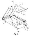 In addition to the crowned or bulging shape of the rear rollers (it is also possible to provide crowned front rollers), one implementation of the present invention, includes a belt guide118 (seeFIGS. 10,25,27, and others) fixed to the deck just forward therear roller assembly112, to help maintain alignment of thebelts18. The belt guide defines a tapered or ramped surface configured to engage the outside edge of the tread belt. The stride of people primarily has a longitudinal force component which causes forward propulsion during striding. However, most people also have a slight outward or lateral force component in their stride. This lateral force component acts on the belts, which can misalign the belts. Particularly, the rear of the belts may be forced outwardly on the rear rollers. Thus, the belt guides are placed on the treadles to engage the outside rear surface of the tread belts. The interaction of the belt guides on the belts helps to keep the belts appropriately aligned between the rollers, and to counteract the lateral striding force of most users.