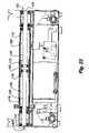 Referring toFIGS. 14-18 and others, each front roller has anaxle62 extending outwardly from the outside end of the roller. The outwardly extending end of the axle defines a threadedaperture66 transverse to the longitudinal axis of the axle. The belt adjustment assembly includes abelt tensioner plate68 slidably supported in a lower70 and upper72 plate. The lower and upper plates are bolted to aface plate74 at the front end of the outside frame member. The upper and lower plates extend forwardly from the outside member and are arranged in generally parallel planes.Channels76 are defined along the length of the lower70 and upper72 plates. Thetensioner plate68 defines atongue78 extending outwardly from the upper edge and a second tongue extending outwardly from the lower edge. The tongues are slidably supported in the corresponding channels of the lower and upper plates. Further, the tensioner plate defines anaxle aperture80, preferably circular and of only slightly larger diameter than theaxle62 of thefront roller22. The axis of the aperture is arranged generally perpendicular to the outside member and is adapted to receive and support the axle of the front roller. The tensioner plate further defines a threadedaperture82 in communication with the axle aperture and adapted to be in alignment with the threadedaperture66 in the front axle when the axle is positioned in theaxle aperture80.