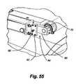 FIG. 54 is a left side view similar toFIG. 53, and further illustrating a schematic representation of the internal valve members of a valve assembly;