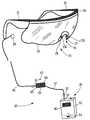 Theeyewear25 also preferably includes a firsttemporal member31 attached to thelens support portion29 on one end of theeyewear25 and a secondtemporal member32 attached to thelens support portion29 on another end of theeyewear25. Thetemporal members31 and32 allow theeyewear25 to be worn by the wearer in a manner conventionally known in the art, and also allow for theconnection cable45 to be distributed rearward from the user's face. Both the firsttemporal member31 and the secondtemporal member32 may be provided with ear receiving portions which are curved to receive the top portions of the wearer's ears thereby retaining theeyewear25 in position on the user's face. Thetemporal members31 and32 may be made from a similar material as thelens26 thereby allowing the wearer to have peripheral vision through the temporal members while at the same time, providing protection from intense light and harmful radiation such as UV rays. To increase utility and portability, the first and secondtemporal members31 and32 may be hingedly attached by integral hinges to thelens support portion29 thereby allowing the temporal members to be folded so as to make theeyewear25 more compact.