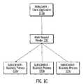 FIG. 1B illustrates, in a block diagram, further details of a computing environment in accordance with certain implementations of the invention. In certain implementations, one client application130 (“publisher”), onetransport structure182, onework request reader130, one in-memory structure140, onestructure processor136, and one business process132 (“subscriber”) are associated with each other. In certain alternative implementations, abusiness process132 may receive work requests from multiple client applications110.