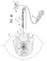 Side cutting surface30 may be extended and retracted by movement of side-cutter deployment shaft44 effected by side-cutter shuttle42.Handle12 includes within itrotary mechanism34 effective to rotateshaft14, and anchorelement extension mechanism36 for extendinganchor elements24 into tissue, comprisingshuttles38 visible in the view shown inFIGS. 1A and 1B.Shuttles38 connect withdeployment shafts40 and41 shown inFIGS. 1C and 1D.Conductor46 provides electrical power todistal cutting surface20 by connectingpower source48 withdistal cutting surface20.Power source48 may be a source of radiofrequency (RF) power.