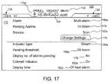 If thedisplay time option162 has been set to something other than “none”, thealgorithm442 then determines whether theoption162 has been set to “of next alarm” or “to next alarm” atstep332. If theoption162 is set to “of next alarm”, the text indicating the time of the next alarm is added to the alarm indicator to create the combined graphic170 shown inFIG. 12. If the “to next alarm” option has been set, then the combined graphic168 is displayed as shown inFIG. 11.