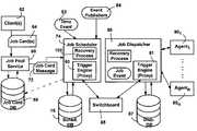 Each trigger engine component (e.g.,60 or61) provides a number of event-related services, including local event registration, remote event registration, event distribution and local invocation. Local registration instructs the local trigger engine proxy (e.g.,60) to notify its local component (the component that invoked the trigger engine) about events. For example, thejob scheduler74 locally registers with itstrigger engine60 for notification of events, while thejob dispatcher86 locally registers with the itstrigger engine61 for notification of events. Remote registration, which relates to the transfer of events between servers, is performed by the local trigger engine (e.g.,60) communicating with the remote trigger engine (e.g.,61) to specify events of interest. Note that as used herein, the terms “local” and “remote” do not necessarily indicate a different machine.