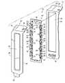 FIG. 2 is a perspective view of theelectromagnetic shield40 secured between thechassis wall20 and the expansioncard mounting bracket30, wherein the mounting bracket has shifted to one side (laterally to the left as shown inFIG. 2). Accordingly, it is generally necessary to slide the mountingbracket30 to the right into an upright position so that theperimeter region34 of the mounting bracket will make contact with each of the fivespring fingers46 on the right side of the shield. Since thespring fingers46 are inclined along theircentral axis48, the right-most edge of the mounting bracket will make contact with thecentral portion56 and ride up and over the spring fingers. Accordingly, thespring fingers46 may be compressed between the mounting bracket and the chassis wall. As shown, thecentral portion56 extends out of the plane to contact the mounting bracket and the opposingtabs52 extend toward the plane to contact the chassis wall. During compression, the spring finger will flex to spread the tabs while maintaining electrical contact between the mounting bracket and the chassis wall. If the bracket is slid downward or upward, the bracket will ride up on one of theinclined tabs52.