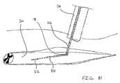 It is further contemplated that the catheter and needle may be positioned independent of the working channel of the endoscope. InFIG. 12A, the injection system and the endoscope are inserted into the patient by way of separate cannulas orintroducers52. Theendoscope34 is positioned through the skin and into thesubarachnoid space50. Using visualization from theendoscope34, two separate side-hole injection needles42 are deployed on generally opposite ends of an injuredregion26 of thespinal cord20. The injection needles42 are positioned to avoid alarge vein82 of the dorsalspinal cord20. Flexiblehollow guidewires80 extend through the side-hole apertures78 and into the injuredregion26. A cell suspension is ejected from thehollow guidewires80 as theguidewires80 are retracted back into theneedles42. As seen inFIG. 12B, a trail ofcells22 is formed extending through the injuredregion26 of thespinal cord20.