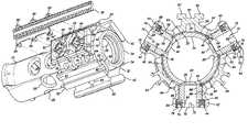 FIGS. 3,4 and5 show theblock32 installed on anM2 shroud24. Eachinner segment46 of eachmain bore44 contains aplug66 having aplug tail68 with a raisedperiphery70 presenting fournotches72 in a cruciform arrangement. Preferably, each plug66 is bored out in order to reduce its mass, in which case theplug tail68 consists of theperiphery70 withnotches72. Eachouter segment48 of eachmain bore44 contains a retainingring74 having an arrangement of fourshallow bores76. Each retainingring74 surrounds aplug tail68.