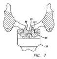 As best shown inFIG. 5, which is a sectional view of the embodiment ofFIG. 4, in a preferred embodiment, each plug66 has clockwise heavy external ACME threading86 engaging clockwise heavy internal ACME threading82 on theinner segment46 of amain bore44. The ACME threading has a rectangular profile and is used because it resists “backing out”. Also in the preferred embodiment, each retainingring74 has counterclockwise external standard threading88 engaging counterclockwise internal standard threading84 of theouter segment48 of amain bore44. Eachplug66 has anose90 which is blunt, rounded, smooth, and too large to fit through aperforation28. Thus, thenose90 may advance only partly into theperforation28, is relatively free to rotate against theshroud24 when positioned at theperforation28, and finds a stable position in theperforation28 when tightened against theshroud24.
