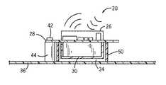 Referring generally toFIGS. 2-4, the exemplary illustratedradio module20 includes a shieldedradio transceiver26 disposed on a printedcircuit board28. In the illustrated embodiment, anantenna30 is mounted on the printedcircuit board28 and electrically coupled to thetransceiver26 through the printedcircuit board28. However, theantenna30 may be etched onto the printedcircuit board28 or formed in some other manner. In addition, theradio transceiver26 may be disposed on the opposite side of the printedcircuit board28 proximate theantenna30. Furthermore, theradio transceiver26 may be disposed separate from theantenna30 and coupled to theantenna30.