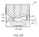 FIG. 99 shows the printedcard226 being withdrawn from the print cartridge,148. It will be appreciated that the printedcard226 needs to be manually withdrawn by the user. Once the trailing edge of thecard226 has passed between thedrive shaft178 and thespring fingers238, it is no longer driven along the media feed path. However, as theprinthead202 is less than 2 mm from thedrive shaft178, the momentum of thecard226 projects the trailing edge of past theprinthead202.