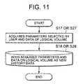 The history dataupdate processing program75, which was read by the managementhost control unit53, updates thehistory data65 in themanagement host database77 based on the logical volume data received from themanagement client49 and the parameter data used as the above retrieval key (this can be acquired from the above mentioned predetermined storage area, for example) (S18 or S28). Specifically, the history dataupdate processing program75 removes the logical volume identifier from the above mentioned received logical volume data, for example, removes the flag from the parameter data which was used as the above mentioned retrieval key, generates anew history data65 based on a plurality of data elements in the logical volume data and parameter data which remains after removal and the date and time when the logical volume data desired by theadministrator48 was selected, and registers thenew history data65 in the managementhost data base77.