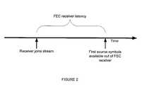 Another important metric is the FEC receiver latency. As shown inFIG. 2, this is the time between when the receiver joins or requests the stream and first starts receiving encoding symbols from the stream until the time when the FEC receiver first makes available source symbols from the stream. In general, it is desirable to minimize the FEC receiver latency, since this minimizes the memory requirements at the receiver for storing symbols before they are decoded and passed along by the FEC receiver, and this also minimizes the amount of time between when a stream is joined and when the stream first starts becoming available, for example for playback of a video stream. One important aspect of minimizing the FEC receiver latency is for the FEC sender to maintain the original sending order of the source symbols, but as we describe below there are many other important design aspects that have a large impact on the FEC receiver latency.