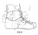 With continued reference to the embodiment illustrated inFIG. 9, aforce direction member120 is disposed adjacent and below thethroat118 on thelateral quarter panel70. Theforce direction member120 distributes the lacing force to an area of the ankle just below thelateral malleolus34. As discussed above, this is typically a problem fit area for footwear. By distributing lacing forces as discussed, theforce direction member120 provides increased support for the subtalar joint. Additionally, theforce direction member120 preferentially directs flexing of the boot in plantar flexion and dorsiflexion to thethroat118 and along themain seam116. This not only helps maintain improved and repeatable response of the boot to foot movements, but also desirably reduces breakdown of the boot by directing boot flexure to a specified location that can be designed to accommodate such stresses. By directing the boot flexure along the main seam in the illustrated embodiment, the force direction member facilitates flexibility at this location and also avoids excessive damage to the panels that would result from repeated flexure of the panel material.