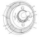 Thebase28 is movable with respect to thehousing24 and is associated with the external gear or member12 (FIG. 5) via leading pins36. Drive member orexternal gear12 hasinternal gear teeth35 that mesh withexternal teeth37 of theinternal gear14 in the conventional manner. Thedrive assembly22, together with theexternal gear12 and theinternal gear14 define a gear drive assembly, generally indicated at33. Hence, selectively energizing the sets34 of actuators26 (e.g., applying voltage via wires W) causes orbital motion of theexternal gear base28 and the attached leadingpins36 which produces motion of theexternal gear12 similar to that ofFIG. 2a-2d, but without using themechanical actuators22. This causes the internal gear and thusshaft40 coupled thereto to rotate. The leading pins36 also help to limit displacements, and can be of the type disclosed in U.S. Pat. No. 5,324,240, or U.S. Pat. No. 1,089,181, the content of each of these patents is hereby incorporated by reference into this specification. In the embodiment, the leadingpins36 are disposed in opening38 that are larger than the diameter of thepins36. Thepins36 are used to transfer motion of thegear base28 to theexternal gear12 or can be driven to directly move theexternal gear12, thus providing driving orbital motion especially when the source of motion cannot be controlled by an X-Y displacement.