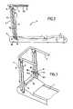 As can be seen in greater detail inFIG. 2, each of the twolateral uprights3 is formed from two arms, namely afront arm8 and arear arm9, respectively. The concept of front and rear are determined with reference to the usual direction of movement of the runningtrack7 in the installation1, as shown by the arrow F. The twofront8 and rear9 arms are close to each other, being parallel and articulated to pivot firstly by their lower ends on theside10 of theplatform2 on a first pivoting axis A for thefront arm8 and a second pivoting axis B for therear arm9, and secondly by their top ends to the lateral branches of the handlebar4 on a third pivoting axis D for thefront arm8 and a fourth pivoting axis C for therear arm9. The first axis (A) and the second axis (B) are offset in height in relation to each other, with the first axis (A) being at a higher level in relation to the second axis (B). These four pivoting axes A, B, C, D and the elements that connect them constitute a deformable parallelogram deformable between a position of use and a storage position, which are illustrated inFIG. 2, as a solid line for the position of use and a broken line for the storage position.