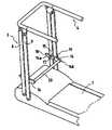 As indicated above, thefront arm8 and therear arm9 of a givenlateral upright3 are close to each other and in parallel. In a preferred method of implementation, which is illustrated inFIG. 2, in the position of use, thelateral uprights3 and therefore the twoarms8,9 are slightly inclined toward the front and, in addition, therear arm9 is resting against thefront arm8 of thesame upright3. This particular arrangement is used to achieve self-locking of the twoarms8,9 in the position of use, whatever the bearing force applied by the user on thehandgrips5, without which it would be necessary to install removable locking means that are particularly strong from the mechanical viewpoint. In fact the force f1exerted by the user when he/she bears onto thehandgrips5 is reflected onto therear arm9 by a force f2that tends to push therear arm9 toward thefront arm8 and therefore deforms the parallelogram ABCD. In this present case, the force f2only contributes to the application of therear arm9 against thefront arm8, and no deformation of the parallelogram ABCD can occur.