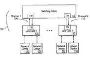 FIG. 1 illustrates a block diagram of acommunication system100. In this example,communication system100 includes aswitching fabric110 and multiple line cards120-130. It should be noted that a transmitter/receiver (T/R) is located at either end of the illustrated communication channels of thecommunication system100. Thecommunication system100 connectsvarious devices122,124,132, and134 to each other.Devices122,124,132, and134 can, in general, include a variety of different devices including computer systems, output devices, storage devices (e.g., disk arrays), or other communication systems such as routers, switches, etc.