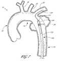 The illustrated embodiment has several advantages over the prior art. For example, some prior art techniques involve placing an inverted bifurcated or “Y” graft into theaorta10 from a branch vessel. In these techniques, a deployment catheter is inserted into theaorta10 through one of the branch vessels (typically one of thecarotids18b,20). The legs of Y-graft are then deployed within theaorta10 with the main trunk extending into the branch vessel. This technique has several disadvantages. For example, inserting a deployment catheter into the branch vessels, especially the carotids, may dislodge plague thereby resulting in a stroke. In addition, the deployment step may temporarily occlude the carotid arteries vessel potentially obstructing cerebral blood flow causing severe damage to the patient. Another technique for inserting a vascular graft into theaorta10 involves advancing a deployment catheter up through the descendingaorta16. The vascular graft is then deployed in the aorta. The vascular graft may include openings or fenestrations that must be aligned with the branch vessels. Branch grafts for the branch vessels may then be attached in situ to the main graft. Such techniques are time intensive and require a high degree skill and experience. In addition, these arrangements may create leakages near or around the fenestrations, leading to endoleaks and eventual graft failure.