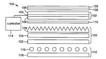 An upper absorbingpolarizer108 is positioned above theLC layer104 and alowerabsorbing polarizer110 is positioned below theLC layer104. In the illustrated embodiment, the upper and lower absorbing polarizers are located outside theLC panel102. The absorbingpolarizers108,110 and theLC panel102 in combination control the transmission of light from thebacklight112 through thedisplay100 to the viewer. In some LC displays, the absorbingpolarizers108,110 may be arranged with their transmission axes perpendicular. When a pixel of theLC layer104 is not activated, it may not change the polarization of light passing therethrough. Accordingly, light that passes through the lower absorbingpolarizer110 is absorbed by the upper absorbingpolarizer108, when the absorbingpolarizers108,110 are aligned perpendicularly. When the pixel is activated, on the other, hand, the polarization of the light passing therethrough is rotated, so that at least some of the light that is transmitted through the lower absorbingpolarizer110 is also transmitted through the upper absorbingpolarizer108. Selective activation of the different pixels of theLC layer104, for example by acontroller114, results in the light passing out of the display at certain desired locations, thus forming an image seen by the viewer. The controller may include, for example, a computer or a television controller that receives and displays television images. One or moreoptional layers109 may be provided over the upper absorbingpolarizer108, for example to provide mechanical and/or environmental protection to the display surface. In one exemplary embodiment, thelayer109 may include a hardcoat over the absorbingpolarizer108.