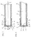 It has been found that variously sized chamfers can be utilized to provide the support necessary to prevent collapse or distortion ofend wall35 during the cutting process while avoiding the need to apply excessive force to the plunger. A chamfer under the radial element helps prevent stretching during cutting. The stretching of the stopper during cutting tends to leave a flap of the thermoplastic elastomeric material of the stopper which could interfere with the retraction of the needle assembly into the plunger.