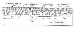 FIG. 3 is a cross-sectional view through an exemplary substrate of complementary poly-silicon contact JFETs showing how individual wells for each device with surface contacts can be formed so as to enable biasing of the back gate junctions between the well and the substrate.