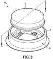 Thedevice10 of this example further comprises, in this case on the lower side of thecarrier plate4, amicrophone33 by means of which the acoustic signal from themembrane5 can be recorded and, if necessary, amplified via asmall loudspeaker34. In this example, thedevice10 forms part of a computer mouse and is provided with a so-termed hotel circuit, not shown, which causes the current supply to most components of thedevice10 to be interrupted if the mouse is idle for a certain period of time. As a result, current consumption is low in that situation. Only themicrophone33 and a control circuit, which is not shown in the drawing, are provided with a permanent power supply. An electric signal issued by themicrophone33 when thebutton5 is pressed is used, in this example, to turn on the current supply to all necessary components. Thedevice10 can thus be readily woken up from “sleep mode” by a user without many additional provisions being required for that purpose.