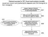 Referring toFIG. 4, an example of algorithm or step307 inFIG. 3 is shown including supervised analysis (wavelet) performed to separate crop into known genetic composition. Imagery or multi-band image should preferably be in same format as origin imagery for original electronic signal parameters mentioned in step403 (percent reflected solar energy, for example) (401). Reflected solar energy may then be converted to electronic signal (an electronic wave) by off-the-shelf image processing software package such as MatLab (402), for example.