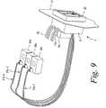 A voltage signal is also produced, by engaging thepower conductor321 with a conductive probe350 (seeFIGS. 27 and 31). Theprobe350 includes ahexagonal shank351 that fits into amating socket352 in athumb wheel353 that fits into a mountingbracket354. Theshank351 extends through a pair of holes354aand354bin thebracket354 to hold thethumb wheel353 in place. The bracket fits between the two clampingelements322 and324 and mates with ablock357 mounted on the surface of theclamping element324. When thethumb wheel353 is rotated, it rotates theprobe350 and thus engagesthreads355 of theprobe350 with mating threads in a hole extending through theblock357. Thethreads355 cause theprobe350 to be advanced into engagement with theinsulation321 on thepower conductor320. Theinboard end356 of theprobe350 forms multiple teeth that cut through theinsulation321 as the probe is rotated and that bite into themetal conductor320 when the insulation has been penetrated.