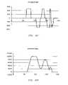 There are four similar charts in each group of figures (FIGS. 6A-D,FIGS. 7A-D, andFIGS. 8A-D). The first chart in each group (i.e.,FIGS. 6A,7A, and8A) illustrates the required power for both motoring and braking. Thus, the first chart graphically depicts the amount of power required by the vehicle. Positive values on the vertical axis represent motoring power (horsepower); negative values represent dynamic braking power. It should be understood that motoring power could originate with the prime mover (e.g., diesel engine in a locomotive), or from stored energy (e.g., in an energy storage medium in a separate energy tender vehicle or in a locomotive), or from a combination of the prime mover and stored energy. Dynamic braking power could be dissipated or stored in the energy storage medium.