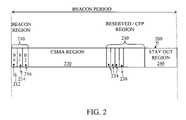 Furthermore, in some embodiments, the allocation of a minimum CSMA region immediately following thebeacon region210 enables thebeacon region210 to increase or decrease in size without requiring a change in the schedule or locations in time within the frame, particularly of contention-free period time slots. Moreover, the minimum CSMA region enables new devices joining the centralized network to determine a CSMA region, for example, by decoding the central beacon. The new or joining station or device may then transmit network associate request messages, for example, messages requesting that the device be enabled to associate with the centralized network, within this minimum CSMA region or time slots.