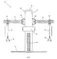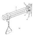 Theextension arm14 is an elongated, hollow, and generally rectangular member. Thearm14 is preferably about four feet in length, although any length in a range of about 2 feet to about 8 feet is contemplated. Theextension arm14 has aproximal end86 nearest thecentral housing12 and adistal end88 furthest from the housing. Thearm14 has an elongated cable slot (not within view) formed in its bottom surface that extends from adjacent theproximal end86 to adjacent thedistal end88. Theproximal end86 of thearm14 fits within thevertical channel84 of the mountingbracket78 and is pivotably mounted therein by anaxle pin90 that extends perpendicularly between, and that is rigidly mounted to, the front and rear mountingplates81 and82. Thepin90 extends through theextension arm14 and engages conventional replaceable bearings located therein for allowing thearm14 to smoothly pivot 90 degrees in either direction from the orientation shown inFIG. 3. The width of theextension arm14 is substantially equal to the width of thevertical channel84 for providing snug engagement between thearm14 and the mountingbracket78 without inhibiting the rotational movement of thearm14.