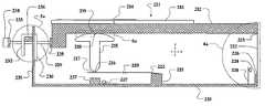 FIGS.5a-5cFIG. 5ais a perspective view, from the side and above and partially sectioned, ofarea5ainFIG. 2a.Key guide projection229 fits without play in aslot510 inguide plate230, and passes with clearance through aslot511 incontrol rail projection231 and through aslot512 inpush stop bracket232. Lateral (x-axis) playing loads are resisted byguide plate230, which is preferably made of a material having a low coefficient of friction, for example PTFE.