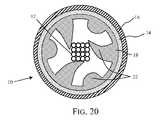 At a cable cross-section that includes thiscoupling element18, one or more of the raisedmembers22 are in sufficiently forced contact with theoptical fiber element12 to become displaced. The raisedmembers22 may be laterally displaced, as shown inFIG. 18, or may be otherwise deformed, as shown inFIG. 20. Regardless of the manner in which thecoupling element18 deforms, raisedmembers22 formed of the novel coupling composition of the present invention will accommodate and secure theoptical fiber element12 within thebuffer tube16.