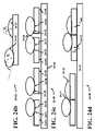 FIG. 29adepicts a view29-1 of a two layered system on mother substrate29-2 containing a daughter and grand daughter layer. The daughter layer comprises: the FPGA29-14, Microprocessor29-12, DSP29-5 and Video Accelerator29-8; and memory substrates29-6,29-16,29-10 and29-3. The grand daughter layer comprise: the connect substrates29-13,29-11,29-9,29-4 and29-17; and the capacitance substrates29-15 and29-7. The connect substrates can have many uses; one is to bypass the output/input buffers of a path connecting the core of one substrate with another, another is to electrically connect metal segments of adjacent substrates together.FIG. 29billustrates a cross sectional view29-18 of how the bypass is made, see U.S. Pat. Nos. 6,465,336 and 6,281,590. The cross section is that of the video accelerator29-8, the connect substrate29-9 and the memory29-3. The video accelerator has a core and would conventionally receive data received from the I/O pad29-20 after passing through the input buffer29-23. The I/O pad can be wire bonded or solder bumped. The input buffer has a delay or consumes time. The memory substrate29-3 has the M-core and conventionally applies data to the output buffer29-19 which drives the I/O pad29-20 and drives a low impedance environment (50Ω) of the package and PWB boards. This requires a large width transistor to apply a signal into this environment and can generate a large amount of switching noise due to the parasitic element environment. The output buffer also consumes time. To overcome the delay and noise issues, the connect substrate29-9 can be used to tap into the internal path between the core and the I/O. These internal tap points are connected to the posts29-21 and29-22 and are called as I/O ports. The connect substrate29-9 has post29-21aand29-22athat are shorted by a metallic path. The posts29-21aand29-22amake contact with the posts29-21 and29-22, respectively. Thus, the I/O components29-23,29-20 and29-19 are bypassed eliminating their delay, noise and power dissipation.FIG. 29cdepicts a cross sectional view29-24 of a capacitor substrate29-26 that connects to a lower substrate chip29-25 which is being moved across the substrate29-25 over the surface of a mother substrate. The capacitor substrate has been charged to the power supply, connects to the daughter substrate and can serve as an auxiliary power supply while the daughter substrate is activating its Coulomb islands to perform movements on the mother substrate. Because the charging and discharging of the Coulomb islands could use power, a capacitor substrate29-26 rides on the daughter substrate and acts as a temporary power supply as the energy in the charged capacitor29-27 is used, for example, see US app 20060122504. One side of the capacitor is connected to the power supply of the lower substrate through the posts29-28 and29-29. Similarly the other side is also connected by connected posts. The energy stored in the capacitor29-27 can be used to allow the lower substrate29-25 to levitate for a longer time period. Although not shown, a DC voltage regulator may be requires to maintain a constant voltage applied to the daughter substrate. When the capacitor is not used, it can be charged by being connected to a substrate that is in its final contact position and has via or similar connection through the substrate to power supplies that, are accessible on the mother substrate.