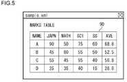 FIG. 4(a) andFIG. 4(b) illustrate an example of a definition file to map the XML document shown inFIG. 2 to the table shown inFIG. 3. This definition file is described in script language defined for use with definition files. In the definition file, definitions of commands and templates for display are described. In the example shown inFIG. 4(a) andFIG. 4(b), “add student” and “delete student” are defined as commands, and an operation of inserting a node “student” into a source tree and an operation of deleting the node “student” from the source tree, respectively, are associated with these commands. Furthermore, the definition file is described in the form of a template, which describes that a header, such as “name” and “japanese”, is displayed in the first row of a table and the contents of the node “student” are displayed in the second and subsequent rows. In the template displaying the contents of the node “student”, a term containing “text-of” indicates that editing is permitted, whereas a term containing “value-of” indicates that editing is not permitted. Among the rows where the contents of the node “student” are displayed, an operation expression “(src:japanese+src:mathematics+scr:science+scr:social_studies)div4” is described in the sixth row. This means that the average of the student's marks is displayed.]
