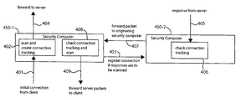 After registering the connection tracking information to the security computer450-2, the security computer450-1 forwards the client packets to the server computer (arrow404). The server computer receives the client packets and responds by sending responsive packets (“server packets”) to the client computer (arrow405). The security computer450-2 receives the server packets from the server computer and checks its connection table for connection tracking information (box406). From the connection tracking information forwarded by the security computer450-1 to the security computer450-2, the security computer450-2 determines that the server packets are from a connection initiated through the security computer450-1 and need to be scanned there. Accordingly, the security computer450-2 forwards the server packets to the security computer450-1 (arrow407). The security computer450-1 receives the server packets, checks its connection table to identify the client computer as the intended destination of the server packets, and scans the server packets for viruses (box408). After scanning the server packets, the security computer450-1 forwards the server packets to the client computer (arrow409). Note that if a virus is found in the server packets, the security computer450-1 may initiate a cleaning action to prevent the spread of the virus, such as not forwarding the server packets to the client computer, removing the virus from the server packets prior to forwarding the server packets to the client computer, or other actions.