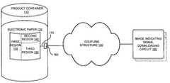 Illustratively, in some embodiments, coupled to theelectronic paper120 may be acircuit160 configured to control the writing of an image to theillustrative regions130,140, and150 of theelectronic paper120. In some embodiments, at least a portion of thecircuit160 may be disposed on, without, and/or within theelectronic paper120. In some embodiments, thecircuit160 may be disposed on or within theproduct container110, or other structure to which theelectronic paper120 is attached. Thecircuit160 may be coupled to theelectronic paper120 across theexternal coupling structure170. Thecircuit160 may be configured to receive an image indicating signal from an image indicatingsignal downloading circuit180 across anothercoupling structure190. Thecoupling structure190 in some embodiments includes illustratively a bus, a wireless connection, and/or a network for transmitting the image indicating signal from the image indicatingsignal downloading circuit180 to thecircuit160, or to theelectronic paper120.