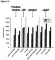 FIG. 16 graphically depicts lycopene levels obtained when the target genes yliE, clpXP, pstC, pitA, and pst operon were knocked out in particular genetic backgrounds compared to maxima observed in previous experiments (ΔgdhA ΔaceE ΔfdhF and ΔgdhA ΔaceE ΔyjiDp). Cells were grown in 1×M9 medium.