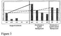 In one embodiment, genes may be “knocked-out” via a variety of means well known in the art, and may include gene inactivation by the introduction of a transposon at a variety of sites, as will be understood by one skilled in the art, and as exemplified herein. In one embodiment, the transposon will insert in between the promoter and gene region, and thus inactivate the gene. In another embodiment, the transposon will insert in between 2 adjacent genes, and thus inactivate one or both genes.