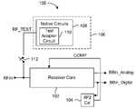 In an IIP2 calibration test mode, thetest adapter circuit110 is enabled and with the appropriatenative circuits108, a test RF signal is generated. This test RF signal is fed into the RFin node of thereceiver core102.