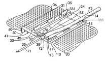 With further reference toFIGS. 5,6 and7, the scalp vein needle (71) is removed from a patient's vein by removing the adhesive tape attached to the second wing (60) from the patient's skin and pivoting the second wing (60) and the covering sheet (40) toward the first wing (20). Pivoting the second wing (60) and the covering sheet (40) toward the first wing (20) extracts the stops (41) from the through hole (38) in the cap (30) and releases the feeding tube (72). Then the feeding tube (72) is pulled from the inlets (14,34) to retract the scalp vein needle (71) from the vein into the safety container. After the scalp vein needle (71) is completely retracted into the container, the limits (13,33) keep the scalp vein needle (71) from accidentally protruding from the outlets (12,32).