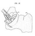 Upon movement ofhandle16 in the direction of arrow A (shown inFIG. 1), the surgeon causesblade34 to engagebone100, as shown inFIG. 13. Clearly, the oscillating movement provided to the blade byhandpiece82 necessarily causes the cutting ofbone100 upon contact withblade34. However, this initial cut cuts only a small width of the bone around the total circumference ofcup72 preferably being slightly larger than the width ofhead37. Therefore, it is noted that in preferred methods, the surgeon typically would slowly operatehandle16 to slowly sinkblade34 intobone100, while also rotatinginstrument10 around the circumference ofcup72. A surgeon should perform this combination translation and rotation method slowly, so as not to cause damage toblade34. Performing these steps, especially the rotational movement ofinstrument10, in excess speed may causeblade34 to bend or sheer. Alternatively, in other embodiments, a surgeon may sink and remove blade34 (by operatinghandle16 in opposing directions) independently of the rotation ofinstrument10. Sequential cuts would therefore begin to create a cut surface that extends completely around the entire circumference ofacetabular cup72. However, clearly this would require an increased time for completely cutting aroundcup72. Further, certain embodiments may include a blade that includes a cutting surface that faces in the direction thatinstrument10 is rotated. This design may aid in the cutting of bone while rotating. Finally, in other embodiments, the cutter blade may be rotated completely aroundaxis59 ofshaft12 if a non-oscillating handpiece or the like is used. In this case, only small advances ofhandle16 should be used during cutting.