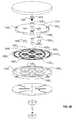 As shown inFIG. 6A, and in accordance with one or more embodiments of the present invention, a force generator applies a downward force tospider plate1510 and to attached posts15401-15404, thereby urging each of movable walls15501-15504attached thereto downward so as to maintain a fluid pressure within each of fluid chambers15601-15604. In accordance with one or more embodiments of the present invention, the force generator comprises:Belleville spring1810 which is held in compression by central screw attachment1820 (central screw attachment1820 is screwed into support plate1835) so as to apply downward force tospider plate1510 and to attached posts15401-15404, thereby urging each of movable walls15501-15504attached thereto downward. In accordance with one or more such embodiments, a baseline of fluid pressure is set by adjustment ofscrew1820 so as to reduce the occurrence of bubbles in the fluid, for example and without limitation, silicone oil, due to evolution of dissolved gas. Advantageously,Belleville spring1810 applies a downward pressure tospider plate1510 without hindering the tilting motion necessary for alignment oftest head3000.