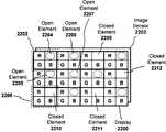 The image captured onimage sensor2203 is an overlapping of images from all of the open apertures, as previously described. This image is then processed and reconstructed, as previously described, frame after frame, and a video image is then output from the system. In this way, theLED display2202 simultaneously functions as a display and a video camera, looking directly outward from thedisplay2202. Note that for a large display, it will not be necessary to create a coded aperture out of the entire display, nor will an image sensor the size of the entire display be necessary. Only a partial, typically centered, area of the display would be used, forming a coded aperture out of open and closed elements, with the image sensor placed behind this partial area. The rest of the display would have all closed elements.