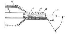 FIG. 7 illustrates a longitudinal cross section of an alterative embodiment, in which the wedge-shaped outer sheath ofballoon catheter10 is a wedge-shaped outer sleeve member40 (instead of the wedge-shaped balloondistal skirt section21 of the embodiment ofFIG. 1). In the embodiment ofFIG. 7, theballoon19 has a cylindricaldistal skirt section41 with a squared-off distal leading face abutting the proximal end of the wedge-shapedouter sleeve member40. Similar to the embodiment ofFIG. 1, the wedge-shapedouter sleeve member40 has a tapered distal leading face forming the wedge-shape of theouter sleeve member40 which tapers at an angle relative to the longitudinal axis of the shaft.